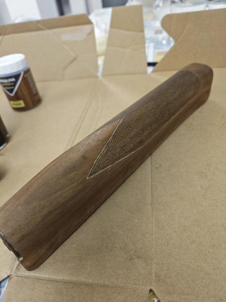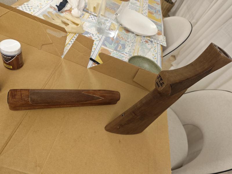 Hola, dos culatras de Benelli 201 del calibre 20, dos maderas diferentes, a una le puse una taco de madera para alargarla. Lijadas, teñidas con nogalina y después aceite de linaza ...