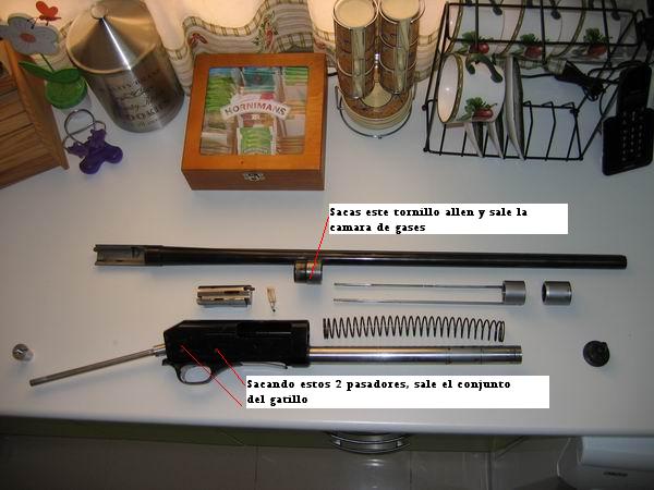 Empiezas quitando el tornillo del guardamanos y a partir de ahí queda suelto el cañón con la tobera y el colector de gases, el pistón.