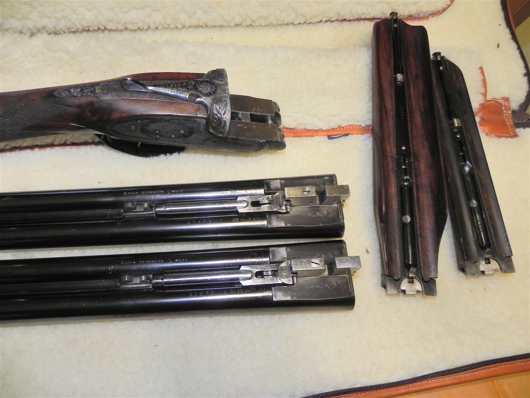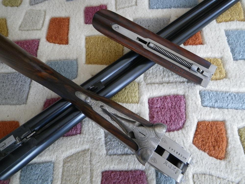 Estoy convencido de que es una 212 S.P. Solamente se diferencia de las de catálogos en el grabado de los coscorros y en las llaves que son H&H en lugar de Purdey (4 pilares). Supongo que esos detalles diferenciadores son por elección del cliente. El grabado es muy parecido al de mi 211, pero los motivos florales varían un poco. Adjunto imagen de un compresor de tipo H&H con muelle interior pero alojado en la parte inferior de los cañones de mi Auguste Francotte.