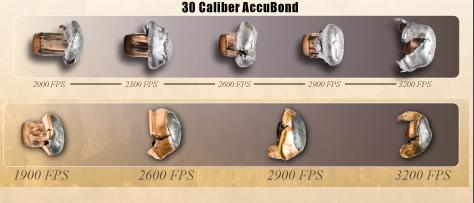 Cada cosa es para lo que es, por ejemplo nosler recomienda no usar la Btip por encima de 945m/seg, tirala con lo que quieras pero que cuando toque el bicho no supere esa velocidad; viendo las imagenes que el propio fabricante pone en su pagina que seran contra gelatina para mi gusto la deformacion correcta seria la indicada en 1900fps para las Btip en animales como el jabali por el tema de los huesos, encambio la Acubond...., bueno mejor mira las fotos :wink: