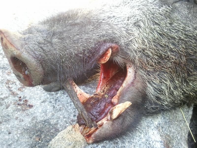4º lance : los perros habian ladrado 15 minutos antes pero nada espectacular, de repente sin ruido alguno se me asoma por la loma de enfrente mio el jabali,sin perros ni ladridos,casi de frente y se para mirandome, sin pensarlo apunto el visor por debajo del morro, disparo y sale corriendo en diagonal y hacia abajo, antes de que se me tape palanqueo rapido y disparo y le toco en el jamon izquierdo, disparan los dos puestos de abajo tres o 4 tiros y se acula en una roca hasta que llegan los perros se acerca un colega y le mete dos tiros con un 300 w para rematarlo.