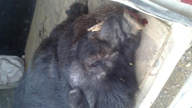 Pues sobre el peso la verdad es que no lo pese, pero por los 90-100 kilos estaba, como curiosidad, tiene un esqueleto mucho mas robusto que el jabalí, la piel mucho mas gruesa y difícil de cortar, como comportamiento, parecía un jabalí, le pegué dos tiros a unos 40m (detrás de la pata y estomago) y corrió unos 50 metros (escopeta cal 12) y al acercarme, ya me di cuenta que no era un jabalí, sobretodo por la forma de la cabeza.