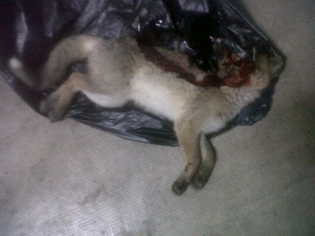 Animal sentado, entrada por el pecho lado derecho, salida por el costillar izd.