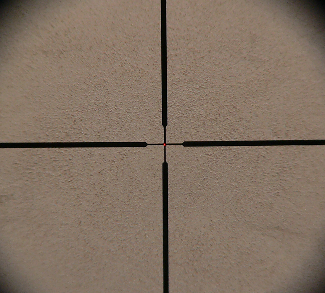 En la primera foto la retícula apagada y en la segunda, la retícula encendida. Te en cuenta que está con la pila vieja, sobre fondo blanco y que en la foto las luminosidades se pierden (en realidad el punto rojo se ve mucho mejor).