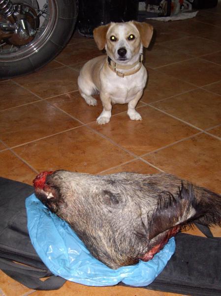 Os cuento, anoche sobre las 21,05 ya tenía ruidos orquestales y al poco tiempo un guarrucho de mala muerte al revolcadero, con un mosqueo que ni os cuento. Trás mucho escudriñar el monte y sobre las 21,45 observo como uno de los almendros abandonados sufría el ataque del que yo esperaba. Lo veo venir, tranquilo a lo que el que estaba en la charca, sale corriendo del lugar. Se para, empieza a oler el ambiente y como era el que yo esperaba, zapatazo al campo, cae, se pone en pie y al perdedero. Salgo a buscarlo, sangre, mas sangre y el cochino sin aparecer, la perra inmejorable todo era buscar para el lado contrario de donde yo iba, en fin para no hacerme eterno, desisto de buscar y esta mañana nada mas amanecer ya estaba en el lugar y allí estaba, pero no os lo vais a creer sin verlo, las puñeteras zorr@s y alimañas se han comido todo el morro, le han destripado y comido todo lo tierno. Todo lo que tenía de enorme pues rondaria los 85/90 kilos, sin embargo como veis pocos colmillos.
