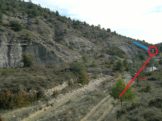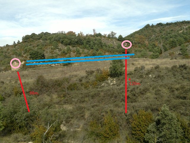 Los círculos rosas son los cazadores. El 1 mató 2 y el 2 mató uno o dos, no lo recuerdo. Las línes rojas son la distancia que tenía con ellos que los tenía a la vista constantemente. La salida del barranco era obvia y no os preocupéis que los señoritos del pueblo ya la tenían bien cubierta.
