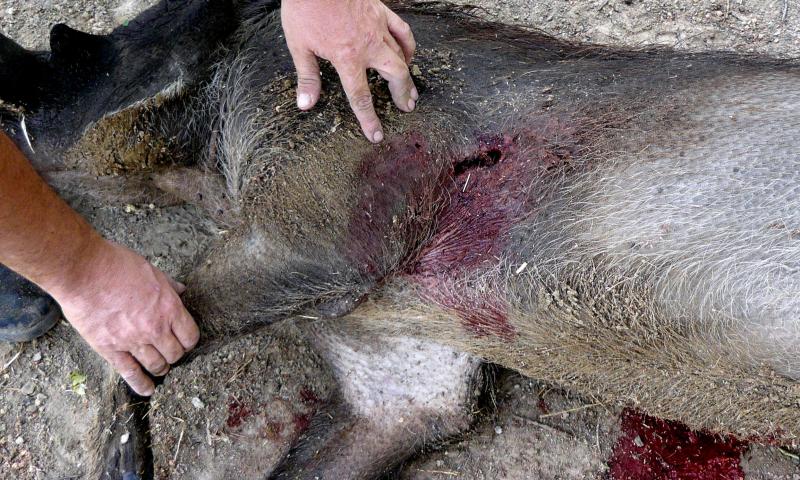 - A un cochino de unos 40 kg. ó 50 kg. con el 9'3x74R, punta Vulcan, le di en el cuello y le quedó la cabeza colgando de una tira de unos 7cm, de piel y algo de carne, en la parte superior. El resto del cuello había desaparecido.