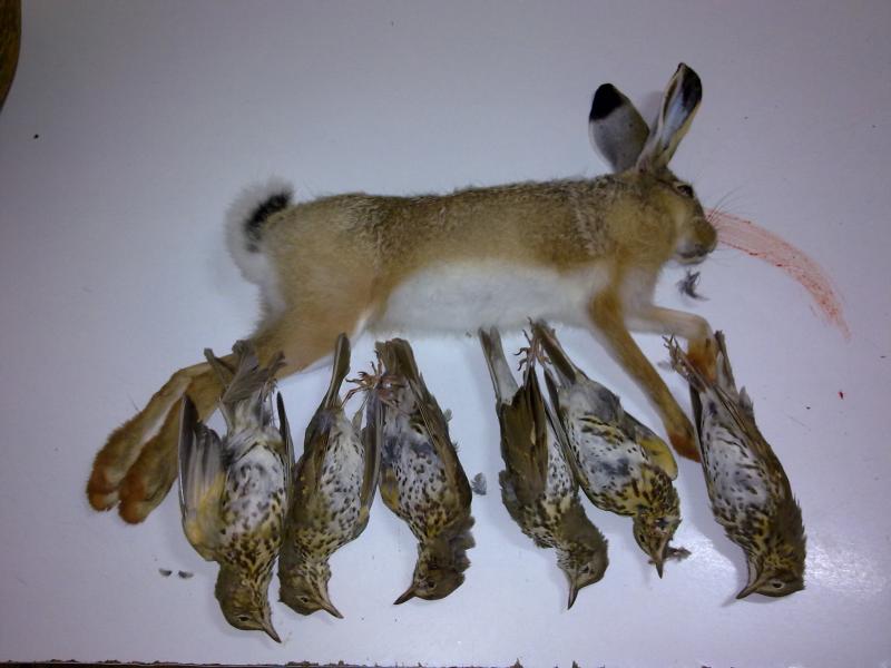 esto es lo de hoy, una liebre, 6 tordos, 2 hurracas.