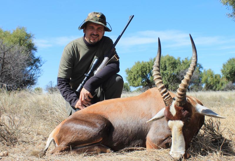 Lo primero que cazé fue el Blesbock, despues de 2 o 3 entradas por fin conseguimos una buena distancia de tiro, disparo y empieza la locura, no es como lo que estamos acostumbrados, o yo por lo menos, en ese momento empiezan a correr animales , si ya se que estaba viendo muchos antes de tirar pero ahora salian de todas partes, tras unos segundos de despiste me centro, veo al blesbock correr y pregunto a Thys ¿pero si le he dado, no?, y me dice, "Si vamos..." le seguimos unos 50 metros y se tumba, le secundo el tiro y se vuelve a levantar y a correr, yo no me lo explicaba, joder si le evuelto a dar, se para en un arbusto y le vuelvo a tirar, por fin, nos felicitamos al llegar a el, es muy bonito, y mi pirmer animal cazado en Africa, inolvidable y sorprendente lo duros que son, estaba dándole con un .300WM y salvo el primer tiro que se quedó un poco trasero como un palmo de la paletilla los otros eran buenos, en fin, una mañana inolvidable por la cantidad de animales que ves, los paisajes, la vegetación, la luz...impresionante.