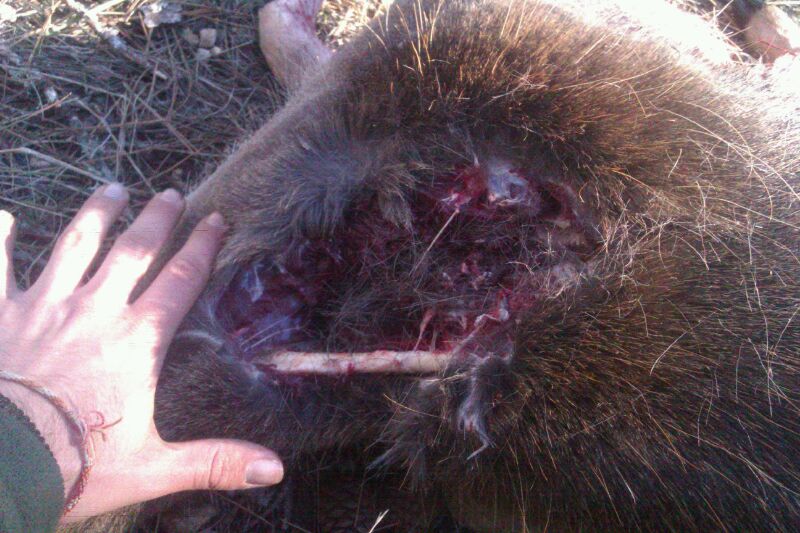 por lo que alivié su sufrimiento con un tiro que la dejó sentada, que por cierto el tiro fué de culo y le dió al cuello, la bala sobrexpandió y lo que se ve en la foto es la entrada, salida no hay... por lo que eso en una paletilla alomejor hace perder la pieza...