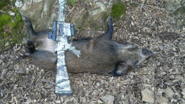 Resumiendo: empieza la caceria y al cabo de un rato los perros llevantan los jabalies y veo venir (no lo oigo) a uno de frente (hacia un viento de narices y en mi contra) asi que a unos 15 metros se para detras de un pino..... le tiro a lo que veo. y cae como un "saco", llegan los perros y entando pendiete de ellos que no salieran fuera de caceriaveo que a la que me doy cuenta sale por mi derecha un jabali a galope tendido de unos 60 k. que no lo habia ni visto ni oido, le pego tres tiros en "plan rafaga" y fallo...