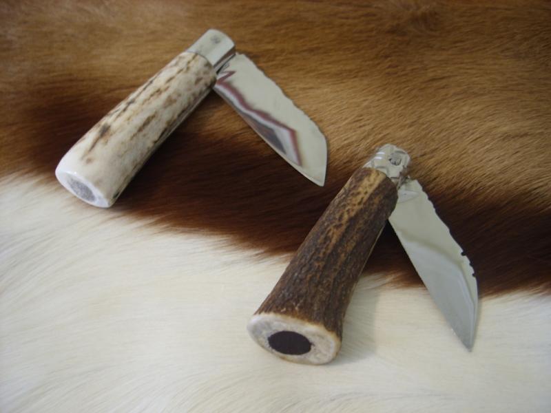 Dos artesanales, están hechas por uno de mi pueblo, se dedica a hacer cuchillos y estas están hechas con trozos de acero que le sobran, mango de cuerno de ciervo y pulidas a espejo.