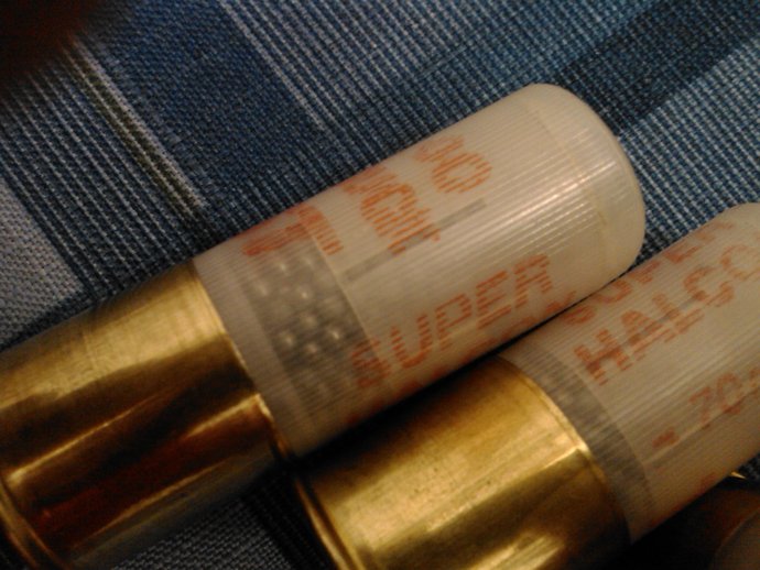 Bueno , pues voy a explicaros en que consiste el invento, el invento consiste en cojer una vaina , ponerle el piston , vertirle la medida correcta de polvora, colocarle un taco separador, sin lenguetas, (es decir el taquito que suelen llevar las postas, cartuchos de fieltro debajo del fieltro, por ejemplo.)colocarle los perdigones del numero 6 por ejemplo, y despues cojer un taco con lenguetas y cortarle el muelle , dejarle solo las lenguetas , colocarselo lenguetas hacia el reves de lo normal, colocar los perdigones bien dentro de las lenguetas y sellarlo con la maquinilla, es decir , asi: