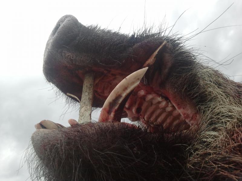 Decir que lo mato uno de nuestros perreros,ya que el jabalí se confiaba de su tamaño y que se enfrentó a uno de los perreros (que no tenía arma) que se pudo defender con una lanza larga y afilada de hierro.Luego hirió los perros y se cruzó con otro perrero que le disparó con una Mossberg de corredera con bala Saga Expansiva a quema-ropa.Pero a pesar del impacto,el jabalí se revolvió y se llevo por delante al perrero,que no le dio tiempo a doblar el disparo,causándole un buen golpe en la rodilla y un pequeño corte en la rodilla con los colmillos.Posteriormente 100 metros más abajo calló fulminado ya con tódolos perros encima.