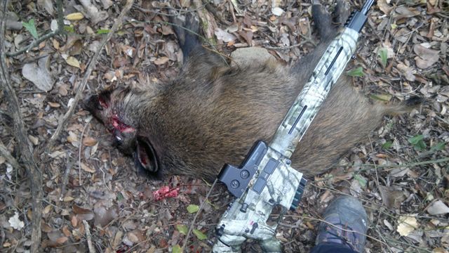 Se lanza barranco abajo,con la perrilla a rastras,es increible la fuerza del animalito malherido,como estaba.Ya entonces libero a la madre,que pronto agarra al animal,parandolo,hasta que ya puedo llegar hasta el y rematarlo.