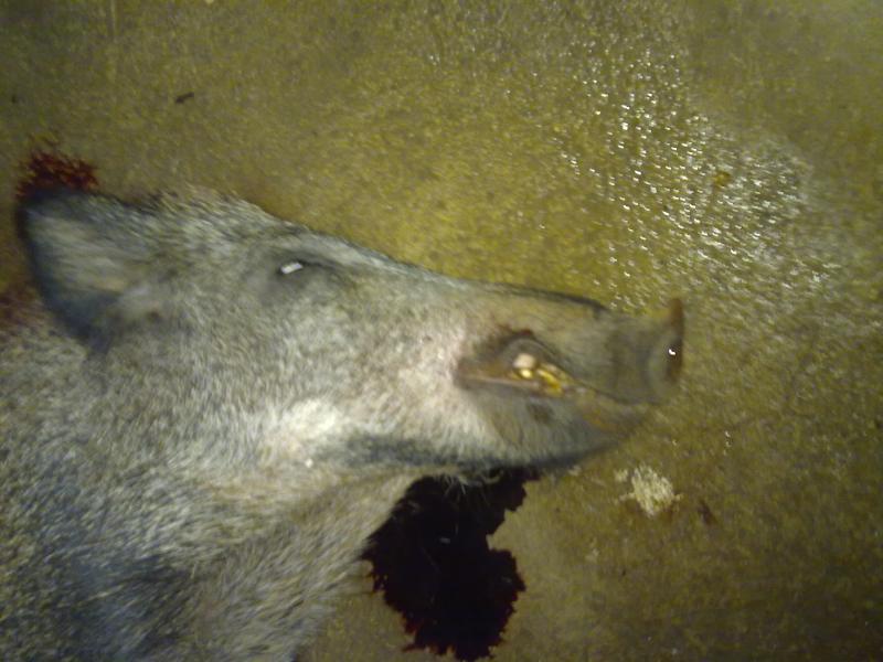 Bueno, señores estamos a últimas de las esperas y empiezan a verse buenos ejemplares, de cuerpo al menos pues este ha dado en la romana 102 kilos y sin embargo me he llevado una desagradable sorpresa con su boca, no llega a 3 centimetros fuera de colmillos y las amoladeras un asco, pero en fin ha cumplido bien y sobre las 21,00 horas he dado cuenta de él, ya contaré mañana el lance.