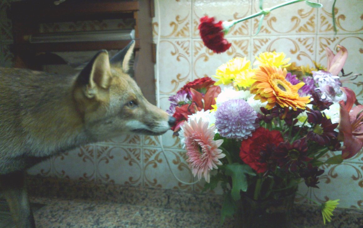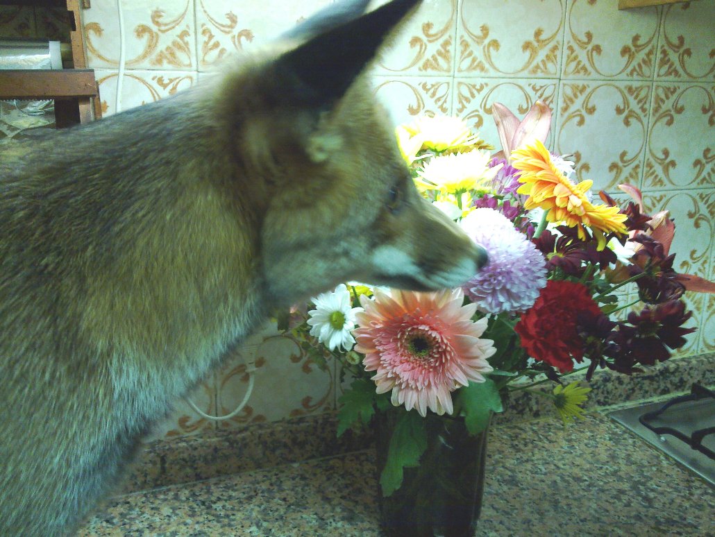 Ayer día 14 cumplió Gupi 9 meses. Le regalé una flores que le habían regalado a mi mujer. El probre..., eran las primeras flores que veía y podía oler en su vida