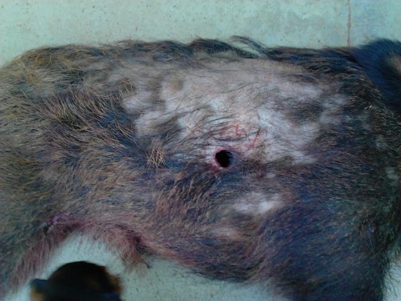 No lo vió el puesto de al lado, y pensaba que se iba a ir en otra dirección, pero pasó por un regaton , como a 20 metros a la carrera, con el primer tiro seguía corriendo, con el segundo que no se vé, (está alto), dió voltereta, la herida de abajo es del cuchillo.