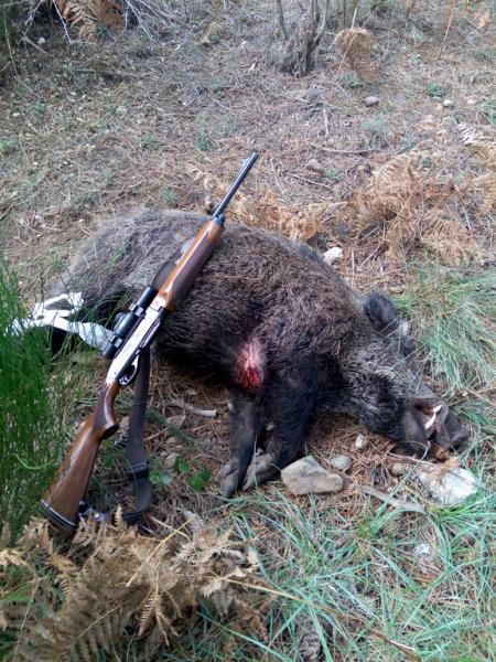 La montería trascurre y tras dejar pasar a unas pepas mas empiezo a oír una ladra en la parte mas alta del barranco y veo a la ristra de perros que persiguen a un gran javali y ostias viene directo a mi el corazón a 300 me encaro el rifle y cuando el cochino pasa como una exalacion por delante del puesto Puuuumm y lo fallo dios Puuuumm el segundo cae al suelo revolcado y se vuelve a levantar jodeeeeer pummmm le vuelvo a pegar y empieza a hacer el molinillo girando sobre si mismo, pienso coño ya esta y una leche el cochino intenta subir la ladera pero los dos tiros que lleva se lo impiden con lo cual coge la caja del arroyo e intenta zafarse de los perros que a los dos minutos ya lo tenían acorralado.