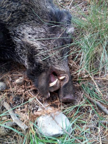 Imaginaros estaba que no me cabía ni la camisa y deseoso de ver el que habían rematado el perrero, como ya la montería estaba llegando a su fin decido empezar a recoger y bajar primero para ver por que había fallado el primer tiro al primer cochino y por ver al otro que estaba allí, al acercarme al tiro comprobé que en el primero como el bicho bajaba por las jaras me encontré varias ramas partidas con lo cual claramente se desvió el primer tiro, baje hasta el guarro que tenia allí y madre la alegría que te llevas cuando ves ese cacho guarro :mrgreen: