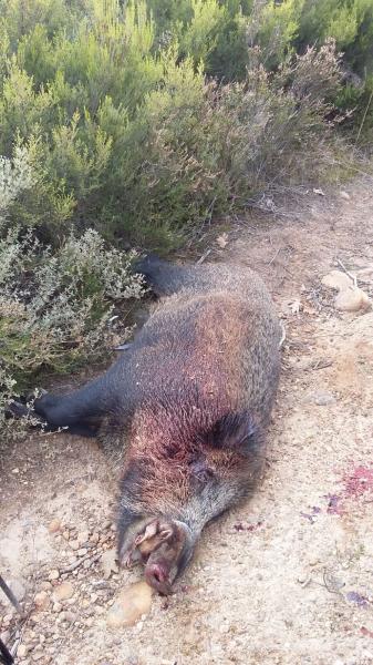 Trascurridos los tres cuartos de hora desde la suelta observo una corza a unos 70 metros por debajo sobre la cuál no puedo abrir fuego por encontrarse los perreros en esa zona, tras varias carreras con los perros y haber tirado la postura de mi izquierda se presenta por debajo de una chaparra, esta vez mas altera y sin riesgo a la hora de disparar, tras dos disparos y a mi opinión alcanzadola en el primero (la tendría que haber dejado en el sitio) continúa la huida parandose donde la vista no me alcanzaba y siendo el puesto de la derecha quien efectua un disparo, posteriormente a unos 150 metros debajo de la postura los perros se harían con el animal todavía vivo y con dos heridas de bala alcanzandola en una pata delantera y el estomago.