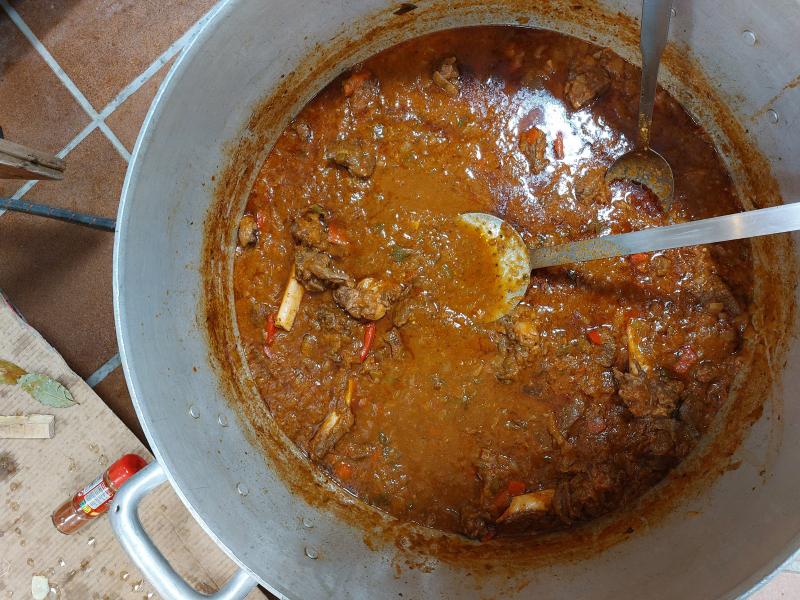 Por supuesto compañero, primero troceamos la carne en tacos medios, también le echamos el hueso, esa carne se salpimenta ligeramente y se dora en una perola con aceite de oliva muy caliente. Así la sellas. Después la retiras y doras cebolla, pimienta rojo y ajos en abundancia, cuando se estén dorando añadimos tomates pelados y le echamos chorizo perro (típico de Canarias, es chorizo de cerdo muy parecido a la sobrasada) un par de chorizos y los removemos con el fondoillo, hasta que esté en su punto y ahí le ponemos la carne y a remover. Unos minutos después le echamos el vino, en este caso para dos patas traseras, le metí ocho litros de blanco. Lo dejamos hervir y cuando lleve un rato, le echamos un litro de mojo rojo con poco aceite (en este caso ñoras picantes, ajos, poco aceite para que no esté muy grasiento, vinagre, sal gorda, almendras, y pimentón), al final un majadito de perejil, y ajo machacado y salamos al gusto, lo dejamos hervir hasta que a media hora del final se le añaden las papas.