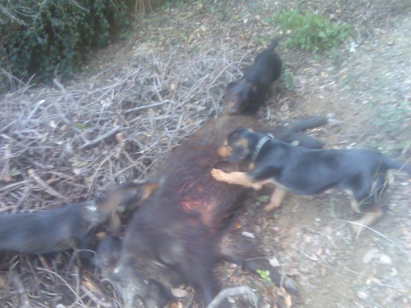 Y aquí la foto de la jabalina que matamos el domingo a la tarde gracias a ese perrito.Un guicho increible,que marca los encames a las 5 la tarde con una facilidad asombrosa.Hay tal confianza que a las tardes solo se suelta a ese perro y otro guicho de "conejos".No os imajinais como quieren los perros a este chavanl,sobre todo para el bocata jeje.
