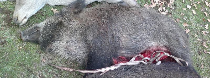 Al finalizar la batida me acerco al puesto de al lado para ayudarle a sacar el jabalí al camino, y cuando lo observo veo que lleva un raspón en el lomo y aunque en la batida me dio igual en el ranking yo creo que eso es primera sangre jojojo