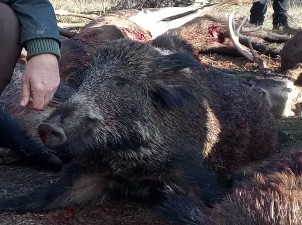 En el segundo guarro se aprecia la salida, un pequeño agujero en mitad del lomo. Por el lado de la entrada el disparo estaba bastante más alto, más cerca del espinazo.. ni acuso el disparo.