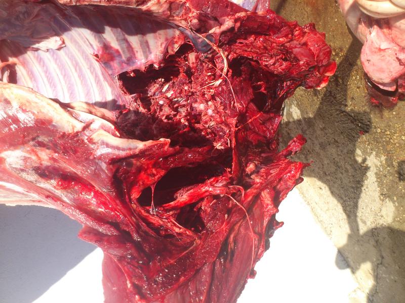 Como podeis ver en las fotos el destrozo interior es exagerado, como una explosion mas que un canal de herida, no saco ni pulmones ni corazon reconocibles, solo un trozo de higado.