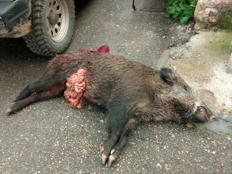 A las 11:30 se da suelta a las rehalas y tras 45 minutos monteando se escucha el primer disparo, posteriormente observo 3 jabalíes entre la maleza que se aproximan a un pequeño claro situado a unos 80-100 metros de distancia, de los cuales conseguí abatir una guarra tras encajarle dos disparos. Mi primer ejemplar de la temporada, esperemos sumar alguno mas