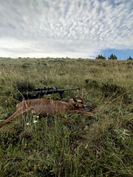 mtjyv escribió:bueno después de desechar alguno en la temporada hasta agosto, por pequeño y de fallar uno a menos de 60 metros, que yo no vi, me vio el a mi y me sorprendió y después del parón de agosto, en septiembre volvimos a la carga, empezamos temprano, sobre las 7 de la mañana, al poco de empezar unas ciervas nos sorprendieron escapándose de nosotros, el pasto esta muy seco y se hace mas ruido del deseado, seguimos y al poco un corzo nos sorprende y se escapa de nosotros ladrando nos, no alcanzo a ver la cuerna, no me dio tiempo, pero si consigo distinguir que es grande y esta gordo, después de eso nada de nada, todo el día andando, buscando las querencias y alguna cierva y poco mas, comemos, la compañía es inmejorable, hoy se ha venido con migo mi mujer, después de comer una siesta, hace demasiado calor, los animales hacen lo mismo, es tontería buscarlos ahora, por la tarde otro paseo por las zonas de querencias, empieza a anochecer y decidimos irnos para el coche, ya es hora, cuando de camino al coche mi mujer me dice, que es aquello, miro y hay esta, tan tranquilo comiendo entre unos pinos, yo ni lo había visto, a vista limpia no se puede apreciar bien, pero coloco el trípode, apoyo el rifle y lo meto en el visor, con el visor lo veo mejor y veo que es tirable, disparo y cae sobre sus patas, no es medallable ni cosas así, pero de los que he visto cazados este año, por mis compañeros es el segundo mejor, la verdad que la foto al ser de noche, tampoco le hace justicia y ademas tiene un cuerno mas grande que el otro y yo voy y hago la foto por el pequeño, pero esta muy decente, buena caza a todos