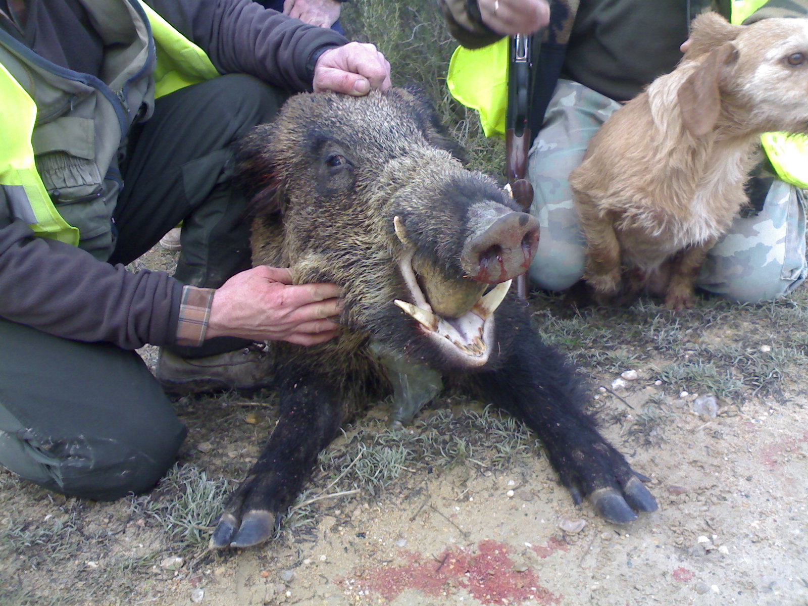 Hacerte con un jabalí grande siempre es una satisfacción porque no es frecuente y la emoción de un animalote en el visor ya es digna de recordar; pero el que más me gustó fue el de esos colmillos pequeños que he puesto arriba porque el lance tiene una historia sencilla pero emocionante desde mucho antes del disparo y de cobrarlo hasta bastante rato después.