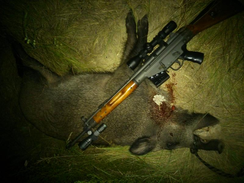 Me entro pronto, a las 22:30 y menos mal que puse almendras en el cebadero para oir cuando las mordia, por que si no ni me entero de que habia entrado. A la segunda almendra que mordio (por asegurarme) encendi la linterna y el bicho se quedo parado, confundido, y cuando vi que iba a marcharse le solté. El animal se quedo en el sitio sin dar un paso, la bala le entro por la parte frontal izquierda y la recupere en el costado trasero derecho. Pues si que mata bien el .307w, aunque tambien lo tenia a 30m como mucho, la bala la tengo en casa, luego le hare foto, un bonito champiñon.