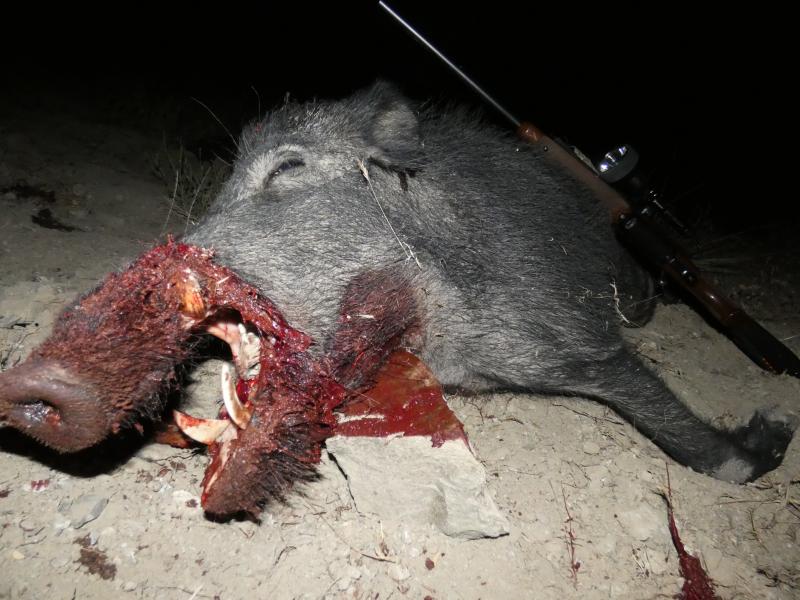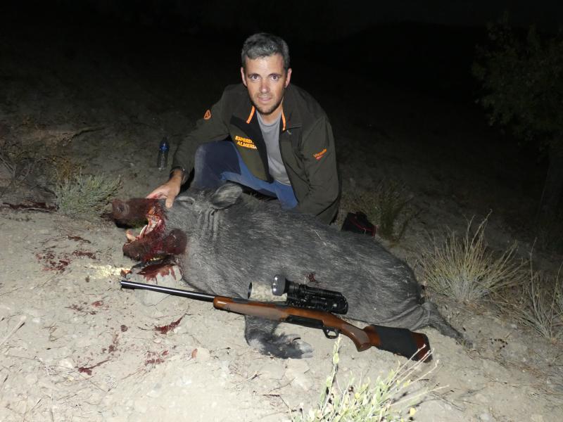 21.30h, la veo, veo una cochina grande de unos 60/70kg entrar desde el barranco de la derecha entre el primer y el segundo cebadero, directa al más lejano. Detrás las crías, 3 de ellas ya apañadas de unos 30/35kg y el resto, unos 4 o 5 más, rayones, algunos bastante pequeños y otros de unos 15/20kg. Tensión, apoyo en la horquilla y observo a través del visor, doy el tope de aumentos (10x) para verlos mejor, me recreo viéndolos, lo disfruto, tranquilo, ya subirán, no es mala distancia para un rifle pero sabiendo que entran al más cercano es mejor dejarlos y asegurar el tiro, al fin y al cabo no he tirado con el rifle todavía, y aunque no tengo por qué dudar de la palabra de quien me lo vendió, que me dijo que lo había dejado muy fino a 100m, al ser con otra bala distinta y más ligera nunca sabes, dudas si la que llevas tú pegará bajo o qué sé yo, ¿para qué arriesgar?.