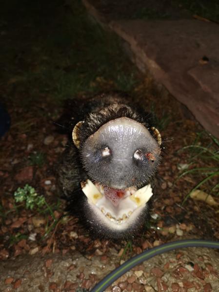 Cuando entran conejos, zorros, tejones, simplemente los mira, incluso si se quedan cerca de nosotros el se los queda mirando, cuando lo que entra es un cerdo lo que hace es que me mira a mi y no agacha la cabeza...