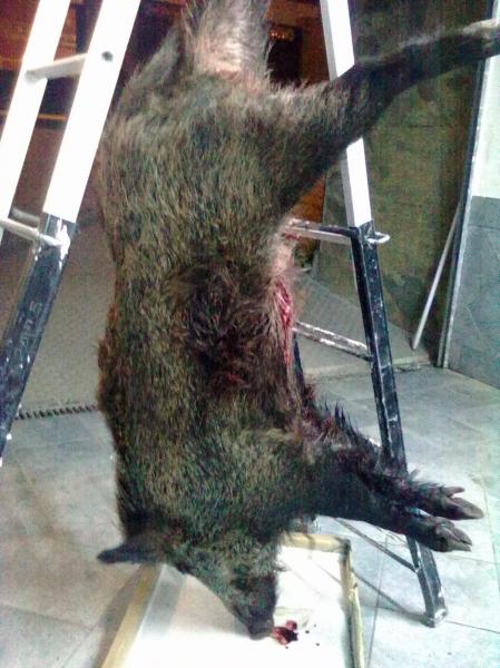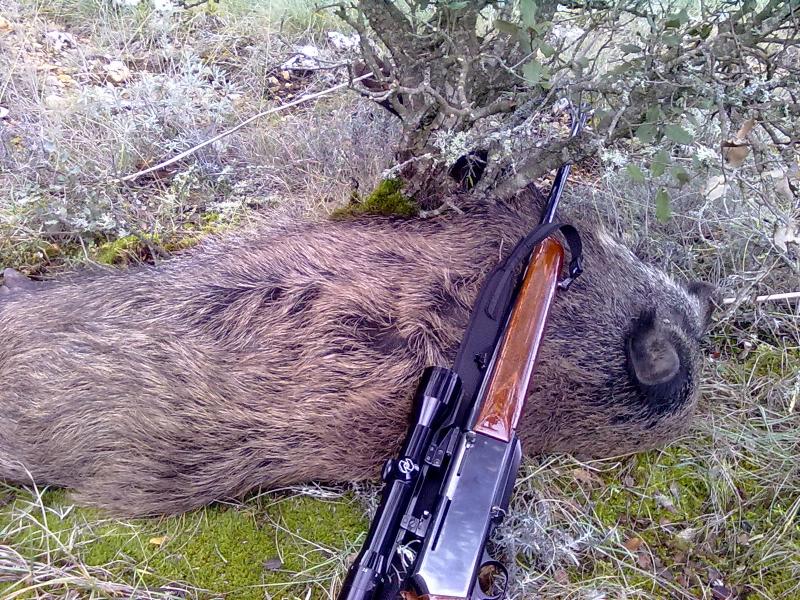 Pues ahí van las fotos,el tiradero estaba muy bien,la ladera de enfrente de un barranco,oigo romper monte y bajar por el barranco pero tapados y por fin salen al claro,tiro al primero en los 3 o 4 metros que tenia sin tapar le doy por encima de la paletilla y da una voltereta,el segundo gira por la ladera y le doy el primero,se me queda algo trasero pero le veo que acusa el tiro y baja el barranco y le secundo el tiro detrás de la paletilla y hay ya no se levanta