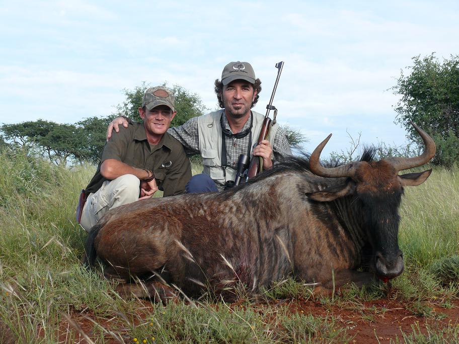 Gracias a todos, la verdad es que en todas las fotos se me pone cara de tonto, no puedo evitarlo. Es curioso que os interese especialmente el lance del Chacal, quizas porque no he puesto la foto, bueno pues aqui la adjunto. La razon de no haberla puesto antes es que tengo cierto pudor en poner una foto cuando no me parece lo suficiente respetuosa para el animal abatido y esta no me lo parece lo suficiente, pero en Sudafrica los gestores de caza, le tienen muchas ganas a este animal ya que come pequeños antilopes y atenta contra sus intereses y prefirieron que cogiera al animal de esta guisa en vez de hacer la foto con el animal en el suelo como con otros antilopes, pero bueno son cosas mias.