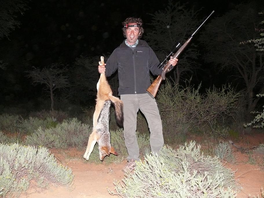 La primera noche, salimos en la finca de Adam, y quedamos Luis y yo en que el tiraba Duikers o Stenboks y yo tiraba algun Chacal si los veiamos, tras ver varios Stenboks y algun Duiker, todos hembras, al fin salto un macho tirable de stenbok que Luis erró, me paso el rifle y esa noche nos volvimos a la casa de tarugo. La siguiente noche, salimos otra vez a la finca de Adam y mismo resultado aunque esta vez nos turnabamos el rifle a ratos y no tiramos nada. La tercera noche y ultima de Luis en Spitkop nos fuimos a otra finca no muy lejos de la de Adam a la que se accedia por un carril sin tener que salir a la carretera. Al llegar a la finca vimos que tenia bastante ambiente, vimos zorros orejudos, animales muy bonitos pero que requieren CITES para su caza, vimos algun gato, sin saberos decir ahora mismo que tipo de gato sería. Luis y yo nos ibamos turnando el rifle y el faro a ratos, cuando se cansaba el que llevaba el faro se lo pasaba al otro y asi recorriamos los carriles de la finca, nos acompañaba tambien Marco Antonio, otro cazador español que habia llegado dos dias antes, asi que la excursion la componiamos Thays al volante, y a la caja Jacko, el PH de Luis, Class, mi tracker, Luis, Marco Antonio y yo. De repente Luis me ilumina unos ojillos entre el pastizal que Jacko identifica como un Duiker macho tirable, pues como yo tenia el 250 06 custom de Adam, me toca a mi disparar cosa que hago y aunque al principio parecio a los observadores que el la bala habia alcanzado el objetivo, tras una busqueda con mi frontal, las luces del coche y el foco, no encontramos al animalito ni rastro que nos hiciera pensar que me habia hecho con el. Le cedo el rifle a Luis y seguimos fareando, al rato enfoco unos ojillos que Jacko identifica como un macho tirable de Steenbok, Luis se prepara, realiza el diparo y el pqueño antilope pega un brinco hacia la izquierda quedando tumbado en el suelo, rapidamente nos acercamos a el para admirar la belleza de este pequeño antilope adornado por unos finos estiletes punzantes como agujas que en este ejemplar eran de una muy respetable longitud. Tras las oportunas fotos de rigor y tras admirar a este mini antilope, proseguimos la noche de caza, esta vez llevo yo el rifle y al poco de reinicier el camino Jacko ilumina algo agazapado sobre la hierba y empieza a gritar shoot shoot! jaja y yo que no era capaz de meterlo en el visor, cuando al final lo logro ver veo que es un chacal que se aleja de nosotros corriendo a toda pastilla para esconderse en unos arbustos que entrecortaban la silueta al fondo como un obscuro telon que estuviera a punto de cerrar la función, justo en ese momento calculo que tengo el blanco en el centro de la reticula y disparo, de pronto todos se preguntan que ha pasado, Marco Antonio dice que lo ha grabado con su camara de video y Thays dice que cree que lo he alcanzado, nos acercamos con el coche y ayudados por las luces lo encontramos muerto al borde de los arbustos con un tiro en la cabeza que le habia hecho desaparecer eso que se da en llamar la tapa de los sesos, todos me felicitan por "el tiro de monteria" aqui no estan muy acostumbrados a tirar alos animales a la carrera. La verdad es que creo que tuve un poco de la fortuna que me habia faltado en otros lances, ya que en su carrera la oscilacion de la cabeza muy bien podia haber coincidido en otra posicion y la bala hubiera pasado por encima sin mayor problema. El calibre que utilizamos es muy curioso y muy efectivo, el cartucho consiste en una vaina del 30 06 agolletado para alojar un proyectil del calibre 243, lo que acompañado por un cañon bull tipo varmint, lo convierten en un rifle muy preciso y muy tenso.
