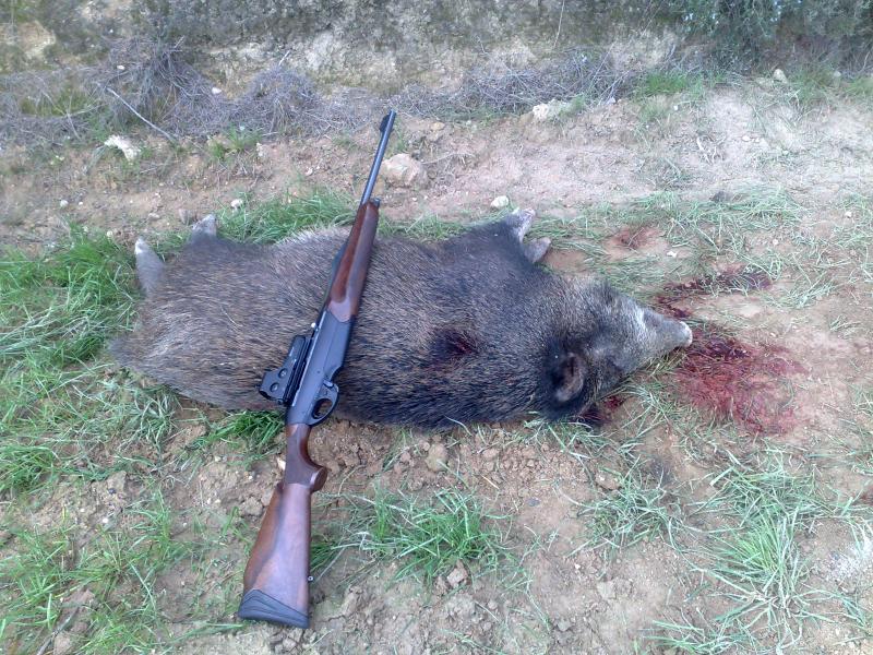En estas que me llama mi hermano por la emisora y me dice que el jabali que he matado esta muy lejos a ver si voy a ayudarme, le contesto: pero si esta muy cerca... resulta que habia tocado el jabali de los 200 metros y habia hecho 10 metros hasta un terraplen que yo no veia y habia quedado muerto.