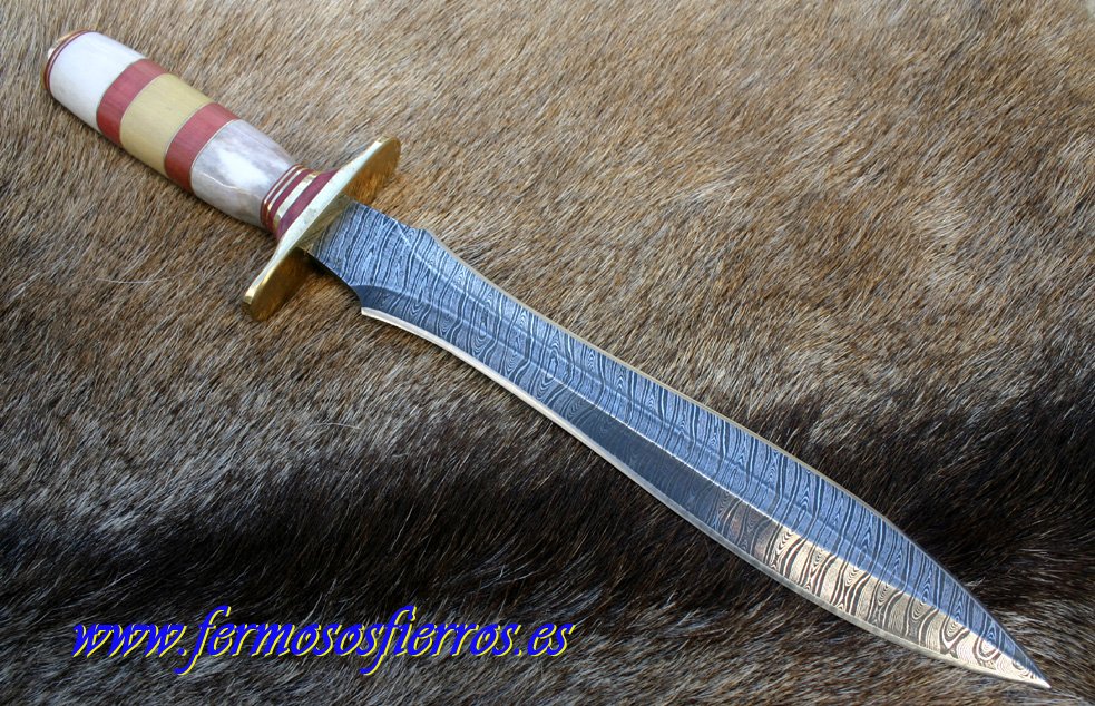 El mio ya lo he puesto alguna vez. Me encanta enseñarlo, es cierto que es muy largo (unos 40cm en total, 28cm de hoja), lo he usado en venado y jabalí y es simplemente perfecto. El damasco se lleva mal con la sangre, necesita limpieza y rapida, a cambio la dureza y el afilado es absolutamente increible. El artesano es muy amable. Le llamas y le pides exactamente lo que quieres y te lo hace solo para ti en exclusiva a un precio contenido (no, no llevo comision)