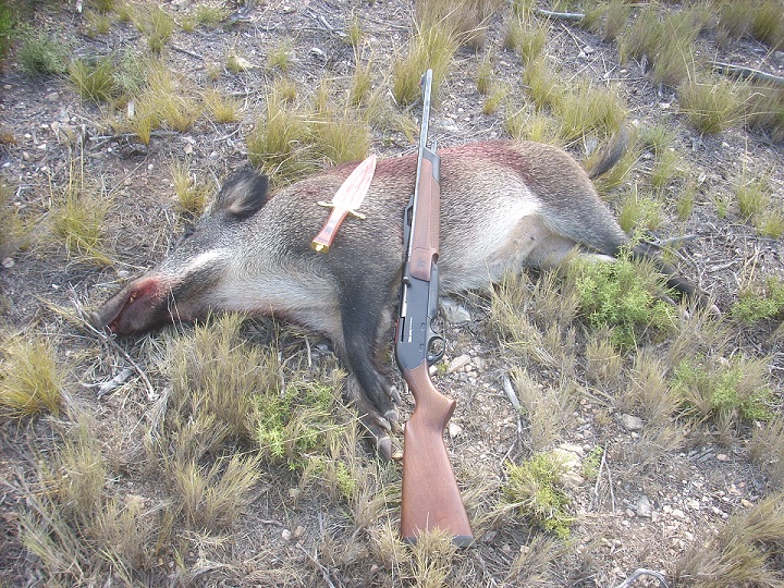 Entraron tres jabalíes y esta se paro un instante delante de mi, cuando encare el arma arranco a correr y le pude tirar a unos 25 metros mas o menos, el tiro quedo un poco retrasado y tuve que re matarlo con el cuchillo, los otros dos pasaron como rayos les tire pero nada a criar