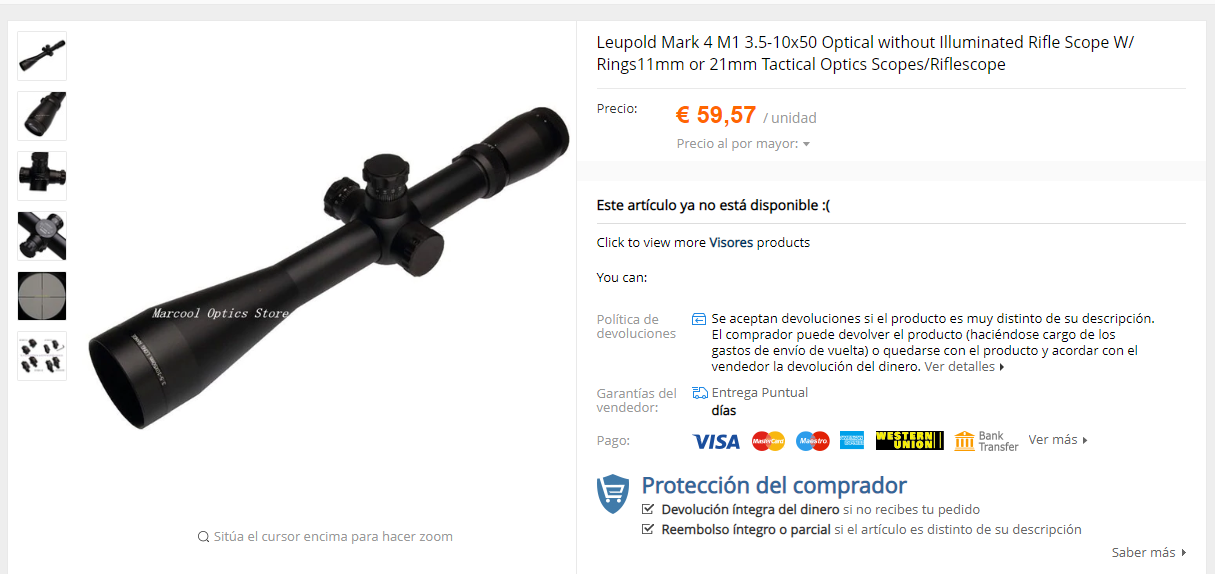 Los Leupold Mark IV, valen 50-60 € en Aliexpress, y se venden a montones, pero la gente los compra sabiendo que son una mala imitación, y dudo mucho que alguien que tenga una mínima idea sobre visores, le cuelen uno falso creyendo que es el real, solo con verlo de cerca, y mirar por su ocular, ya se nota.......y vamos, que no solo hay Leupold falsos, hay todas las marcas premium del Mercado, solo se libran por el momento Meopta e Ior Valdada, para airsoft y cosas así, no están mal.......y esto, no es ninguna novedad, no es algo del mes pasado, ya hace muchos años que existen, incluso yo me compre uno hará unos 7 años para una escopetilla de plomillos, y no se rompió.........aunque la calidad, tanto de óptica como de mecánica, dejaba mucho que desear, y si le encendías la retícula, no veías nada, reflejaba la luz por todos los lados......