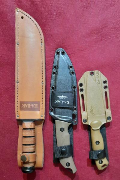 Cuchillos que van muy bien son los Kabar por su variedad y por su acero muy cómodo para trabajar con ellos, de precios no se pasan, mis últimos tres de la marca te paso fotos.