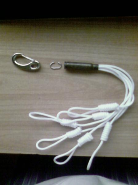 Ahora os pongo unas fotos de la anilla metalica, del mosqueton y del lazo, el lazo es corredizo del tipo "nudo del ahoracado" o "nudo de horca".
