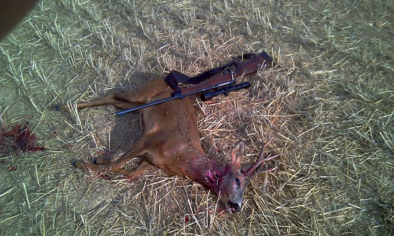 Pues el ultimo día en Castilla y Leon, el 7 de agosto, después de recechar durante toda la mañana y torearnos una parejita de corzos, se consiguio el trofeo. El rifle es un MAUSER M03 7mm REM.Mag, la munición RWS punta KS de 162 grains. El tiro fue a unos 200 metros, vamos, que se encontró con el.
