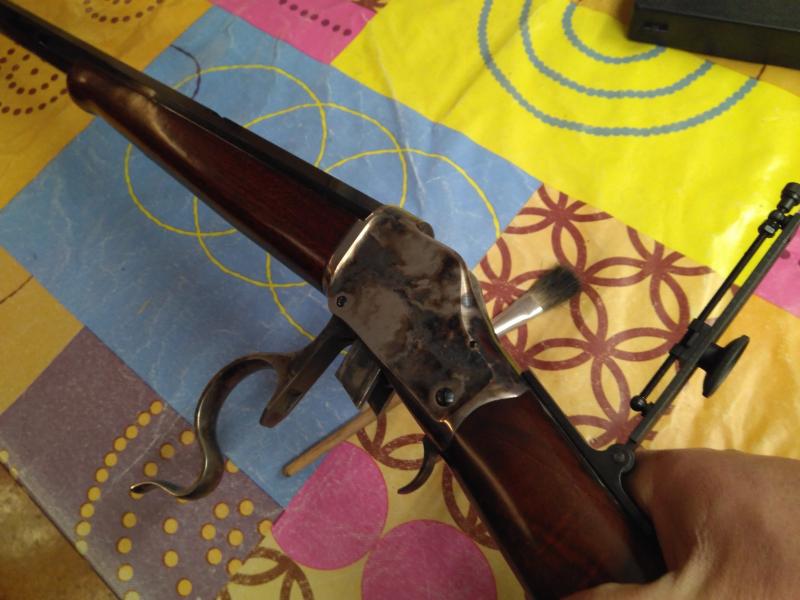 Tengo este rifle en calibre 45colt, un Hege-Uberti falling block 1885 High Wall, Una pieza jodidamente rara de ver por españa, en su dia se tuvo que esperar un año desde que se encargo hasta que llego y costo una pasta gansa, lleva tunel y dioptero, es muy preciso, pero quiero reducir los calibres que recargo en rifle por lo que voy a ver si alguien me propone algun cambio interesante.