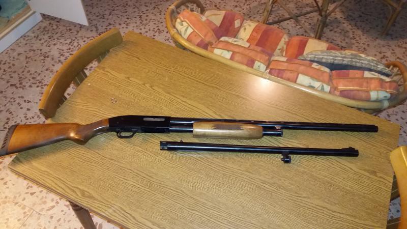 Hola. Cambio en Madrid una Mossberg 500a con cañon liso de 71cm con rosca para polichokes y un choke de tres estrellas y otro cañon estriado para bala con miras de rifle.