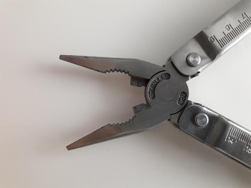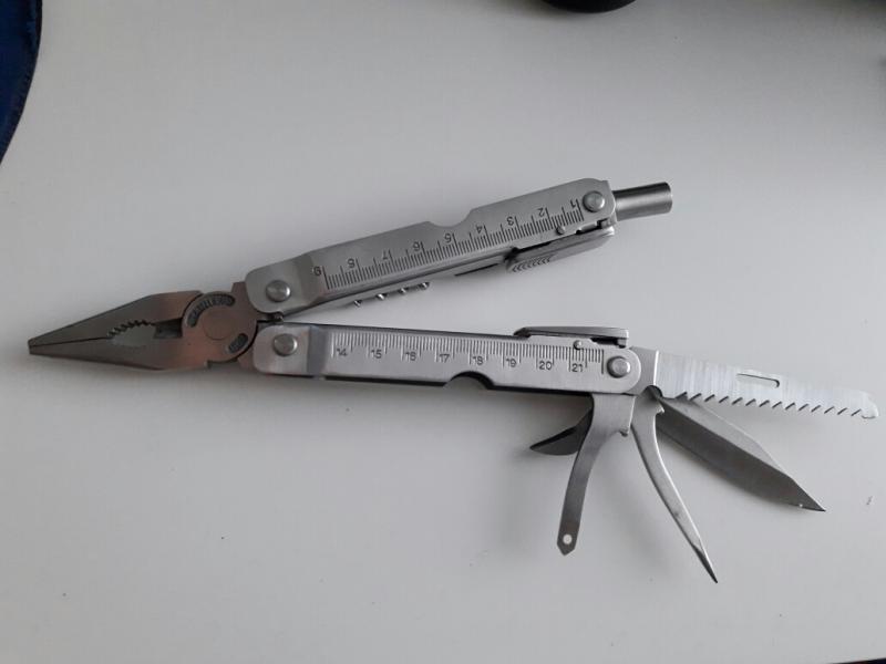 multiherramientas acero inox 2cr marca Baladéo, 12 usos, Alicates de punta delgada, corta alambres, prensa terminales, abre corchos, pelacables, adaptador puntas para destornillador, etc, Sierra madera, navaja, punzón, regla, abre latas, punzón coser cuero, etc. con seguro para todas las funciones. Muy buen estado. Aceptaría cambio por Cuchillo similar al de la foto.