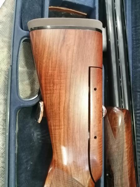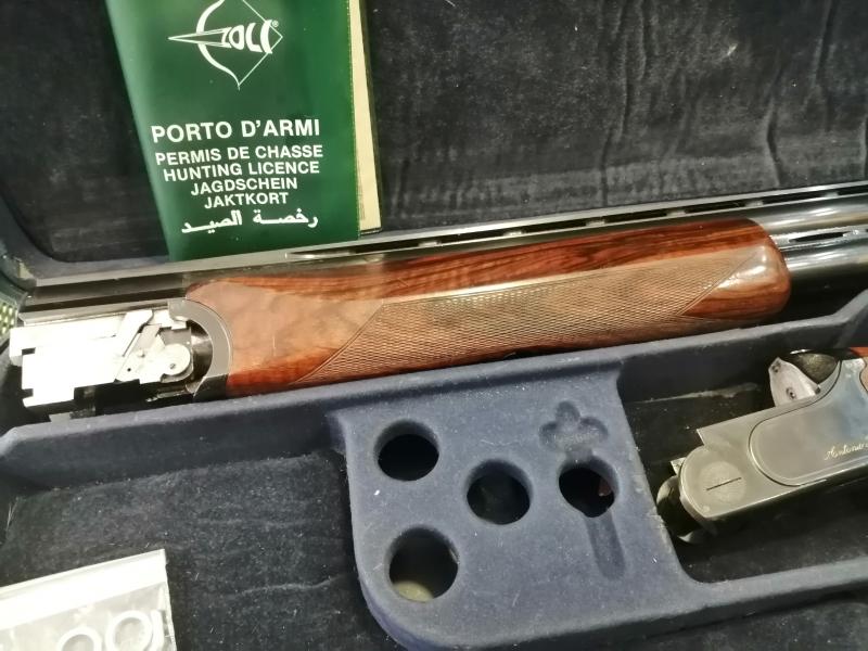 Extraordinaria escopeta ,de la más, que prestigiosa firma de armas Italiana. Resulta una autentica delicia disparar con ella, tanto por su reparto de masas, que la hace muy equilibrada , como por su expectacular plomeo en ambos cañones . Su estado pasaría por nuevo , perfecta de pavón, maderas y mecanismos . Usada en contadas ocasiones. Cantonera mejorada especial antirretroceso. Culata regulable. cañón de 76 y 1 y 2 estrellas .Maletín original rigido. Se cambia por rifle de caza o visor de mi interés y similar valor de nuevo y estado, que mi arma.